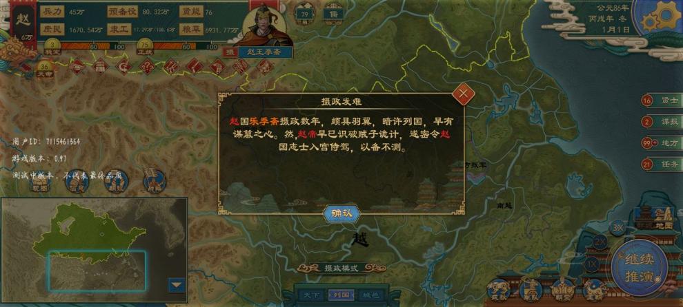 3、如果选择自己继续玩,则会获得debuff幼主当国,国内稳定值,叛乱值,猜测值都会增加/减少,且极其容易暴毙夭折,引发公子夺位。