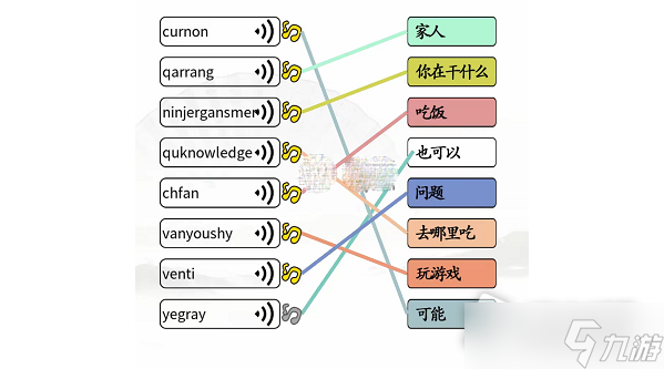 2、对岚语不了解的玩家,可以通过首字母和基本读音进行猜测。比如ninjergansmer 读起来就像是你在干什么,chfan就是吃饭,venti读起来也很像问题,按照这种思路,全部连接完成即可
