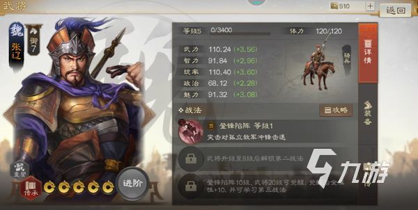 大家可以通过上图看到在角色详情页中的右侧,有很多不同的数字,第一排的是角色等级以及体力显示,而第二个区域则是角色的各项属性,具体内容比如张辽,他的武力值达到了110,智力值达到了91,统率达到了110,政治达到了68,魅力达到了91,而在游戏中武力值,智力值以及统率值都是直接关乎该武将在游戏中的伤害以及承伤效果,当然要是越高的话,则角色越强。