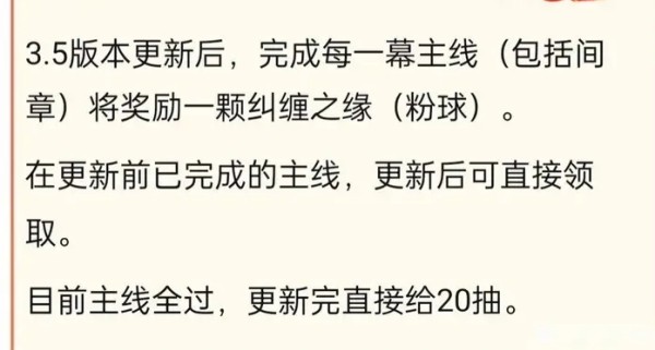 3、玩家在3.5版本之前完成全部主线在更新后即可获得20抽。