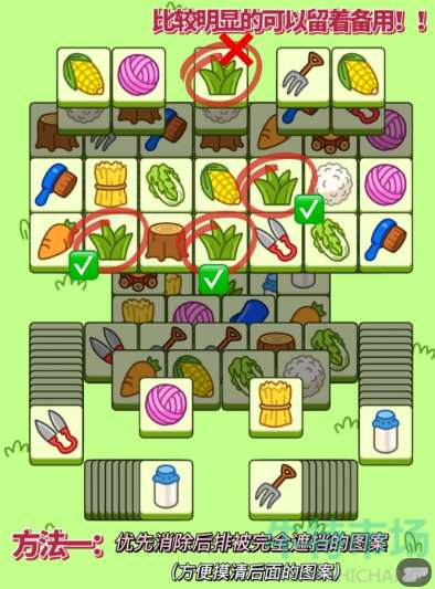 2、优先消除最顶端的方块物品查看下一层的刷新物品,利用下方的四个堆叠方块作为辅助搭配中间方块进行消除;