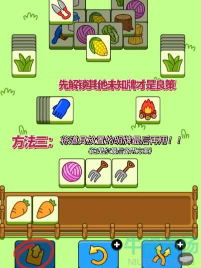 3、值得注意的是把正下方的放置道具方块放在最后使用,哪些显而易见的方块可以放置在一边,先把底牌亮出来。