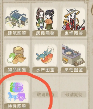 2、图鉴里面有很多的图鉴,比如建筑图鉴、居民图鉴、鬼怪图鉴、物品图鉴等等,我们打开特性图鉴即可;