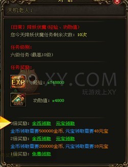 而降妖除魔每天总共有12次,每次都可以用金币来刷新任务的等级,等级越是高,获得的经验和功勋值也就越多,完成任务的时候当然也能用金币或者元宝来提交完成任务,这样就可以获得更多的经验。
