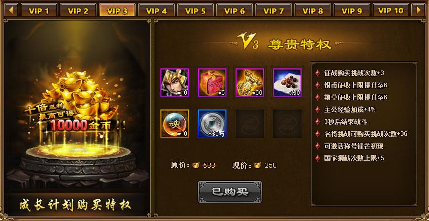 在极品三国志里依旧有大家熟悉的VIP功能,目前VIP等级最高可以达到10级,每一级对应的特权奖励都不同,那么平民玩家充到VIP几是最划算的呢?下面就让小编来给大家介绍一下吧!