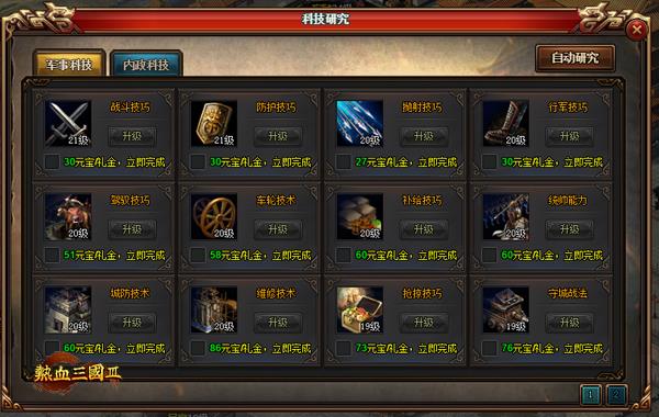 《热血三国3》是一款以三国为背景的战争策略类页游,《热血三国3》中的科技分为内政和军事两类,内政类自然是关于城市建设、资源生产,还有各种有利于内政建设的杂七杂八的科技。而军事科技则非常好理解,就是提升战斗力的科技。而在游戏中,如何利用好这些科技,就是玩家需要注意的重中之重啦!