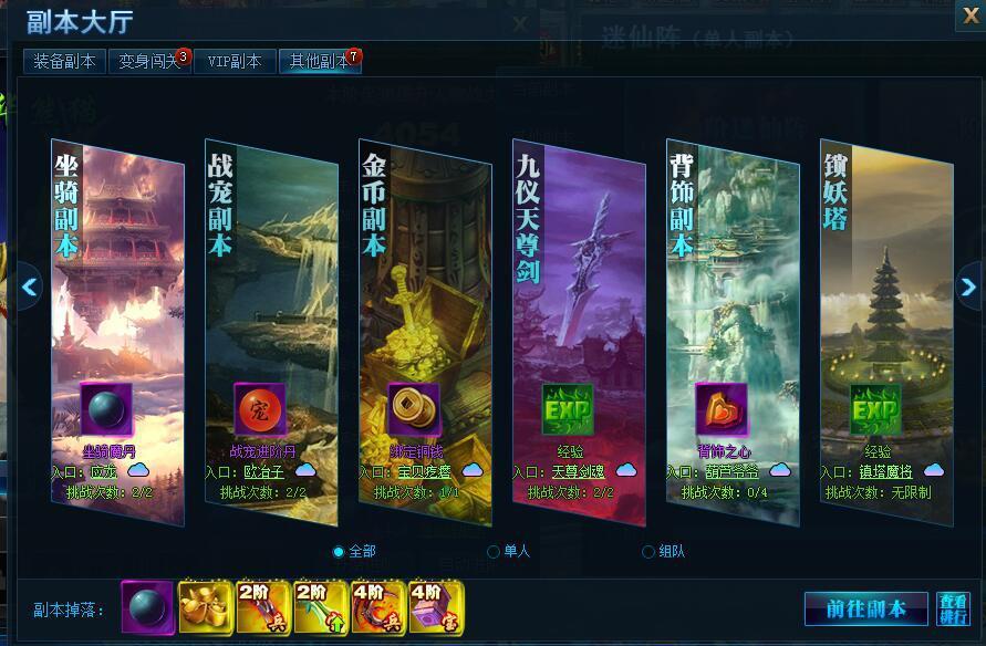 玩家选择自己想要打的副本,点击进入即可,进去以后,迷仙阵是分层的,打完一层自动进入下一层,击杀boss以后,掉落大量奖励,有坐骑魔丹、绑定元宝、体力丹等等。